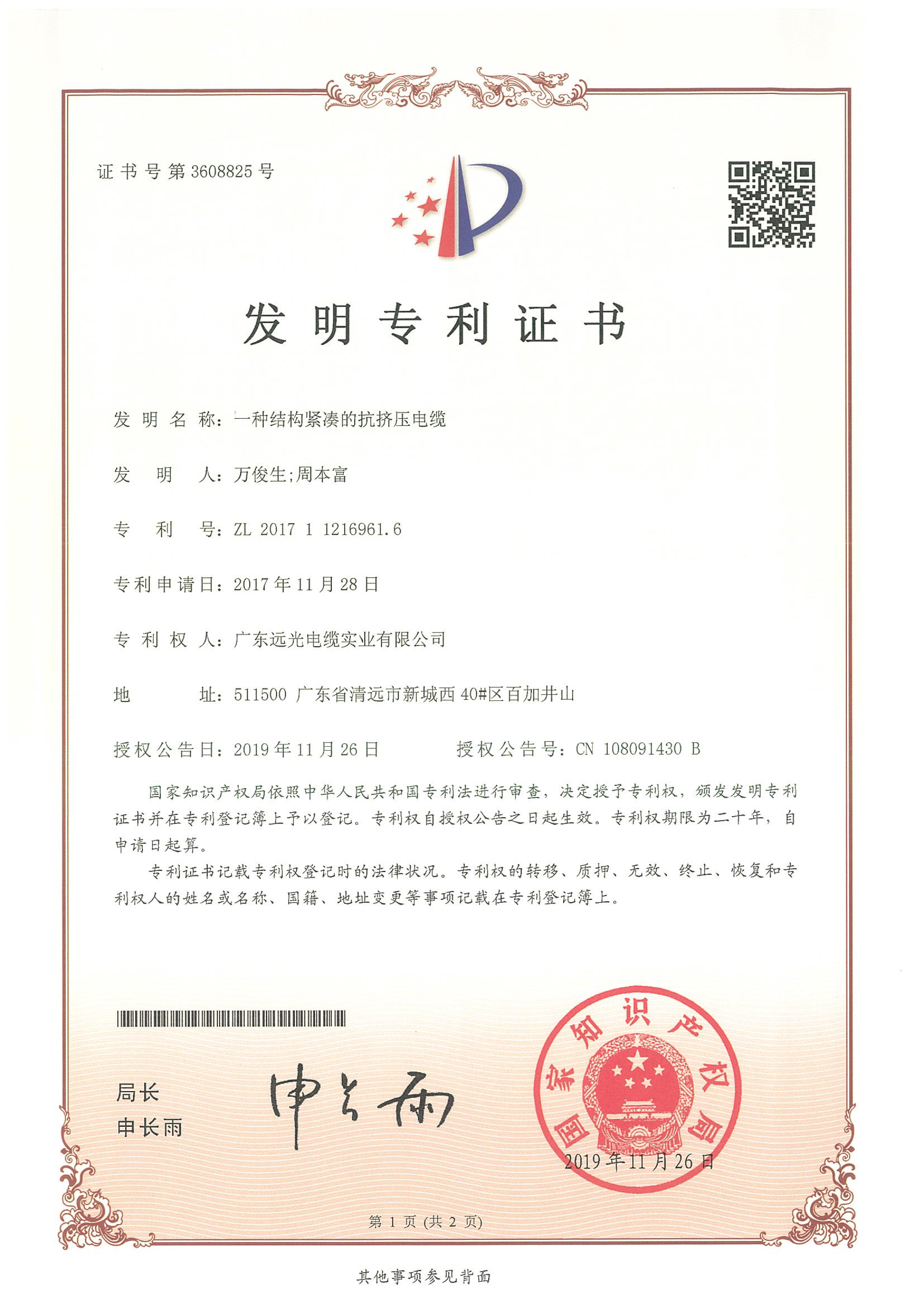 发明专利:一种结构紧凑的抗挤压电缆