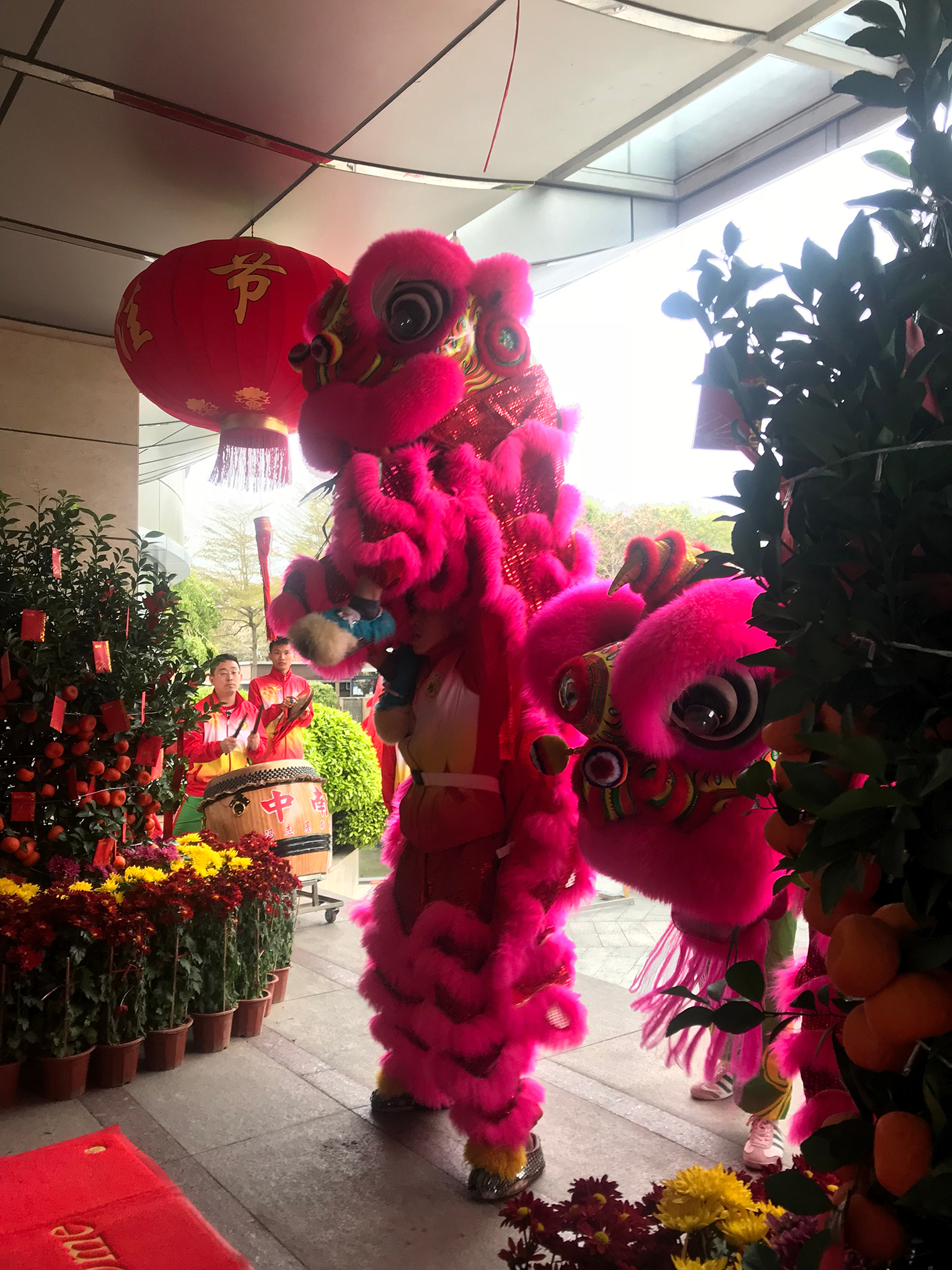 仪式最后,在震耳欲聋的锣鼓声中进行了狮队武术表演,演员们将雄狮的各种表情和动作演绎得活灵活现,还带来了独具特色的“高杆采青”表演,采青完毕后,两只狮子的嘴里“吐”出“恭祝健康发财、笑口常开”的祝福,赢得了在场一浪接一浪的喝彩声。