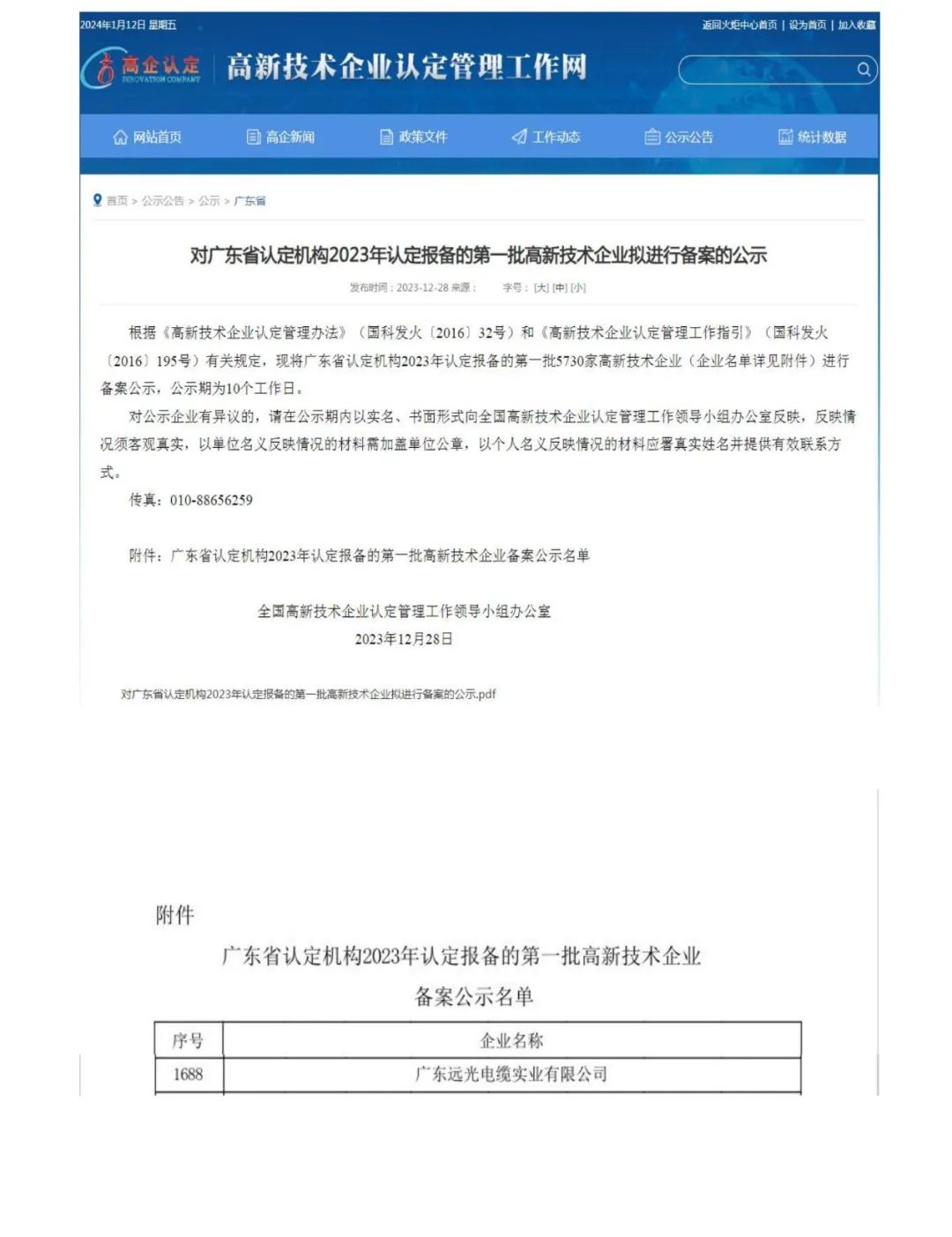 新年伊始,远光电缆便收获喜讯——成功通过高新技术企业复审!12月28日,全国高新技术企业认定管理工作领导小组办公室发布了《广东省认定机构2023年认定报备的第一批高新技术企业备案公示名单》,经过公示期,广东远光电缆实业有限公司已成功通过高新技术企业复审认定。公司自2017年首次被认定为高新技术企业后,至今已第二次通过复审,这是国家对远光电缆公司研发能力的充分认可!