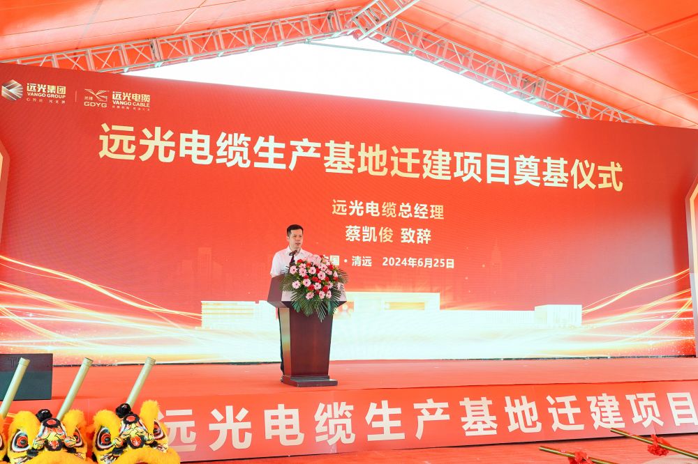 远光电缆总经理蔡凯俊在致辞中表示,代表公司董事会向长期以来关心、支持远光电缆发展的各级政府领导、社会各界朋友以及今天莅临现场的每一位领导嘉宾、远光同仁表示最热烈的欢迎和最诚挚的感谢。远光电缆扎根清远36年,与清远共生共长,是这个城市建设与发展的见证者和参与者,也是清远与实体经济共生共荣的生动注脚。在新时代新发展阶段,远光电缆主动融入清远经济社会高质量发展大局,不断寻求新的发展和突破,以期实现转型升级,为清远的高质量发展增添一抹靓丽的底色。他表示,远光电缆生产基地迁建项目的奠基,意味着远光电缆即将迈入新的发展阶段,迎来新的机遇和曙光。远光电缆在建设和打造新产业基地的过程中,将继续秉持“诚信、品质、传承、创新”的核心价值观,守正创新,踔厉奋发,坚持以科技为引领、创新驱动为引擎,深化产学研合作,强化“新制造”能力,加大对科技创新、人才创新和管理创新的投入,将培育和发展新质生产力作为战略核心,驱动企业向高端化、智能化、绿色化发展转型。