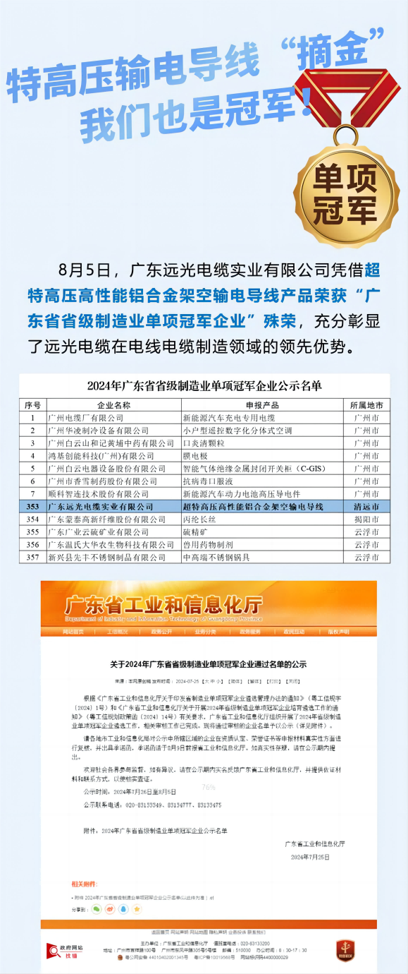 超特高压输电导线“摘金”,我们也是冠军!——远光电缆成为广东省省级制造业单项冠军企业