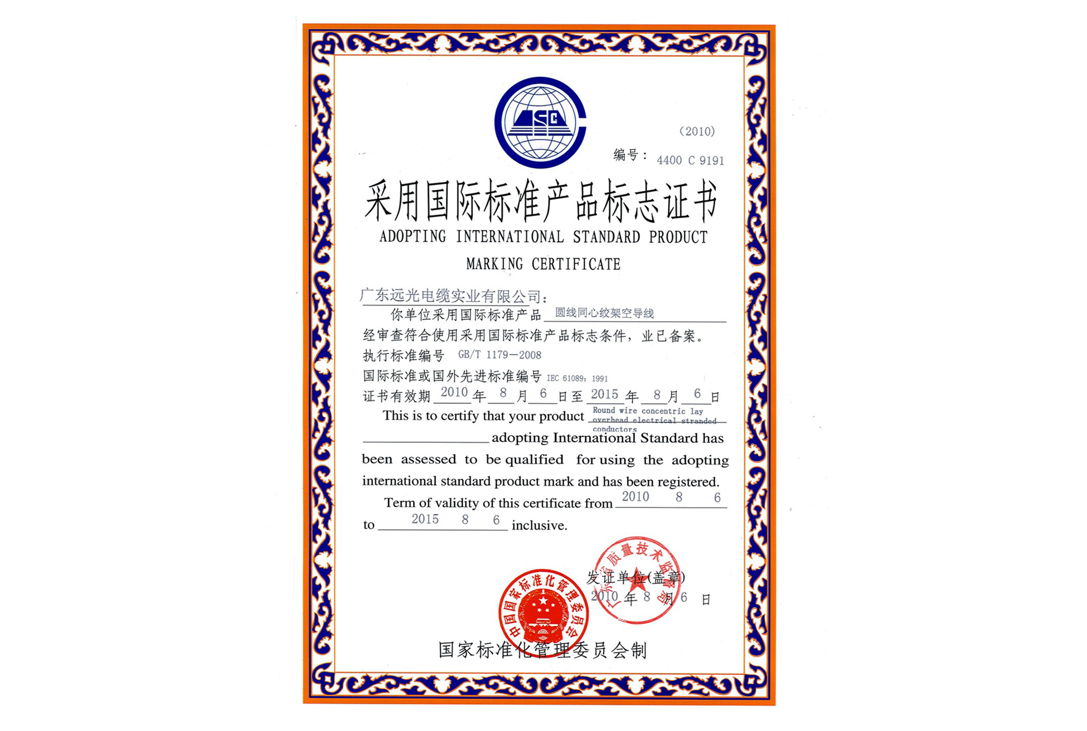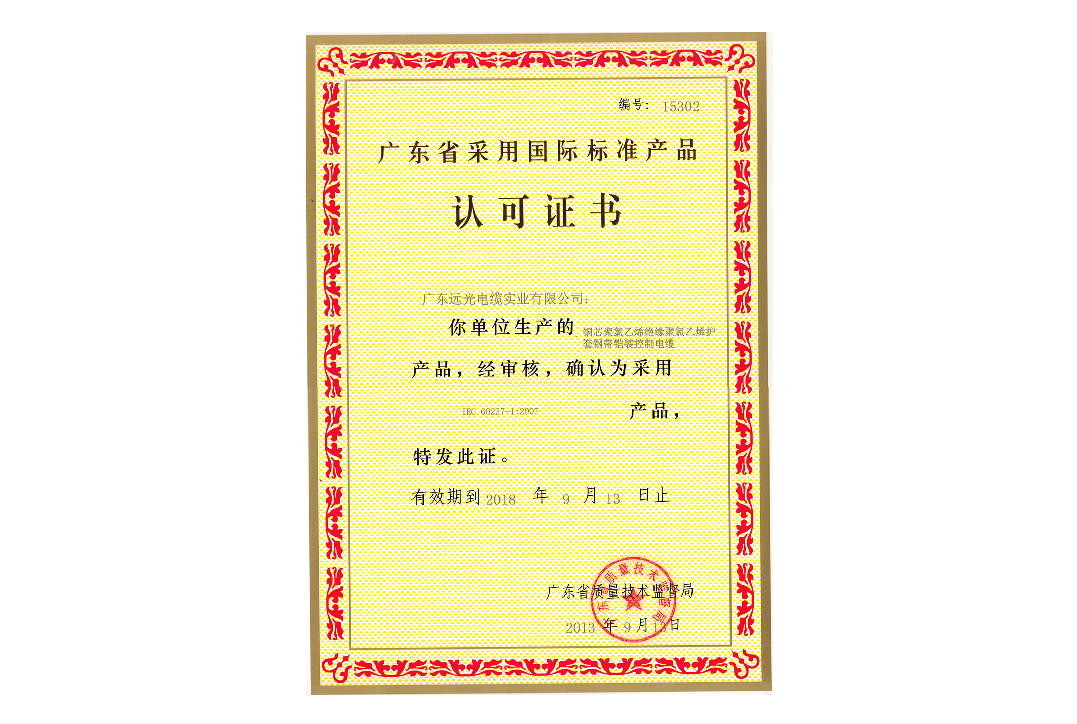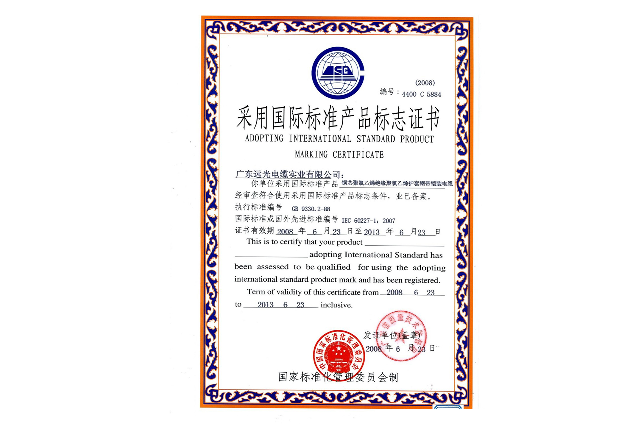 采标证书-额定电压450V/750V及以下聚氯乙烯绝缘电缆