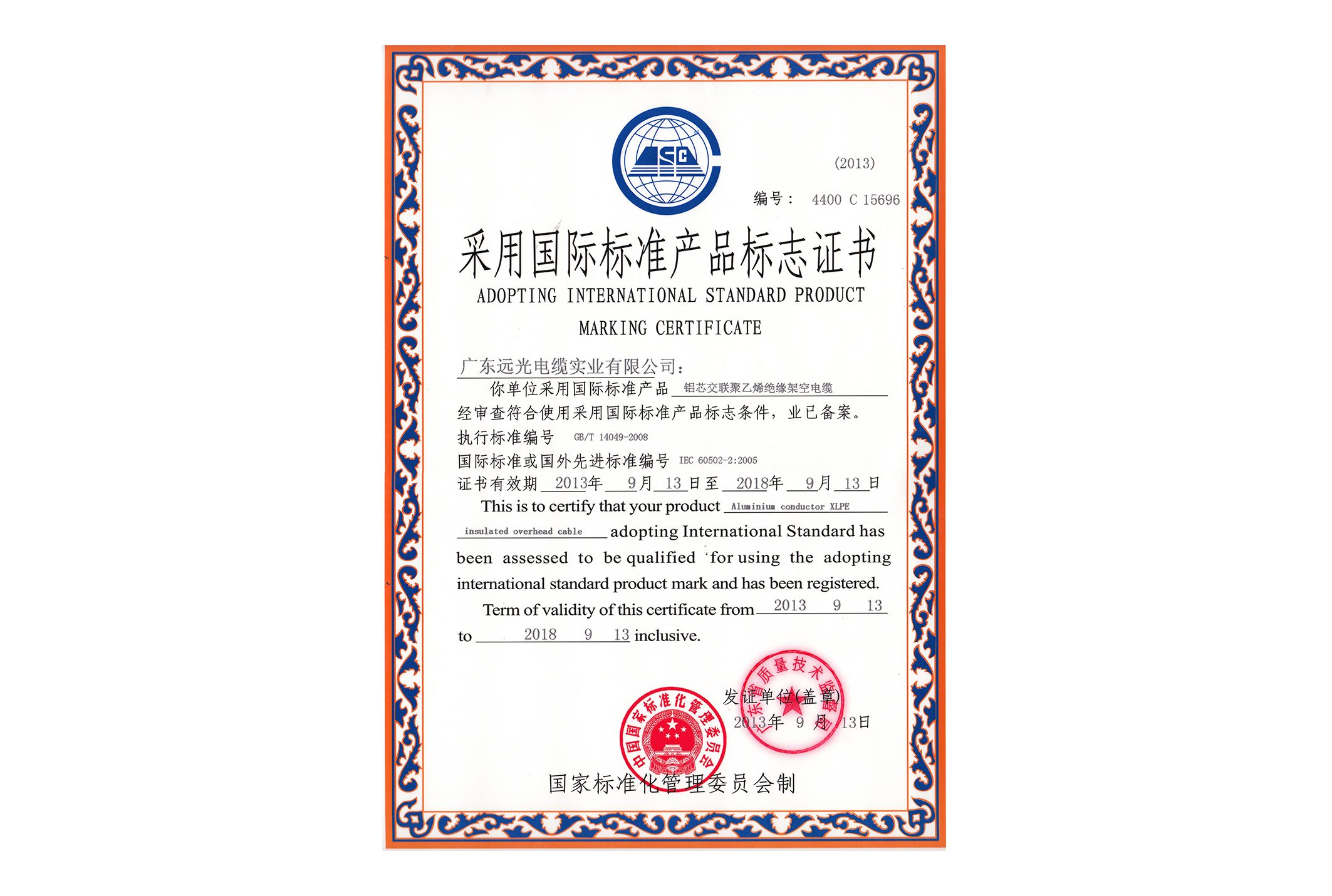 采标证书-铜芯交联聚乙烯绝缘架空电缆